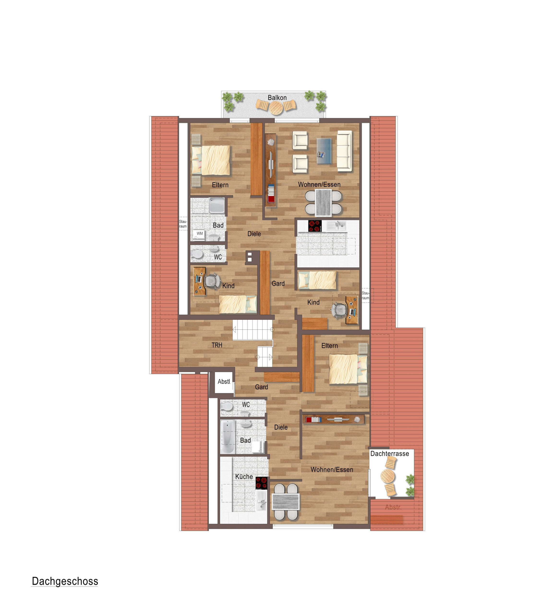 Im Dachgeschoss befinden sich eine 4-Zimmer-Wohnung mit Balkon sowie eine 2-Zimmer-Wohnung mit großzügiger Dachterrasse, die einen schönen Ausblick und zusätzlichen Wohnkomfort bietet.