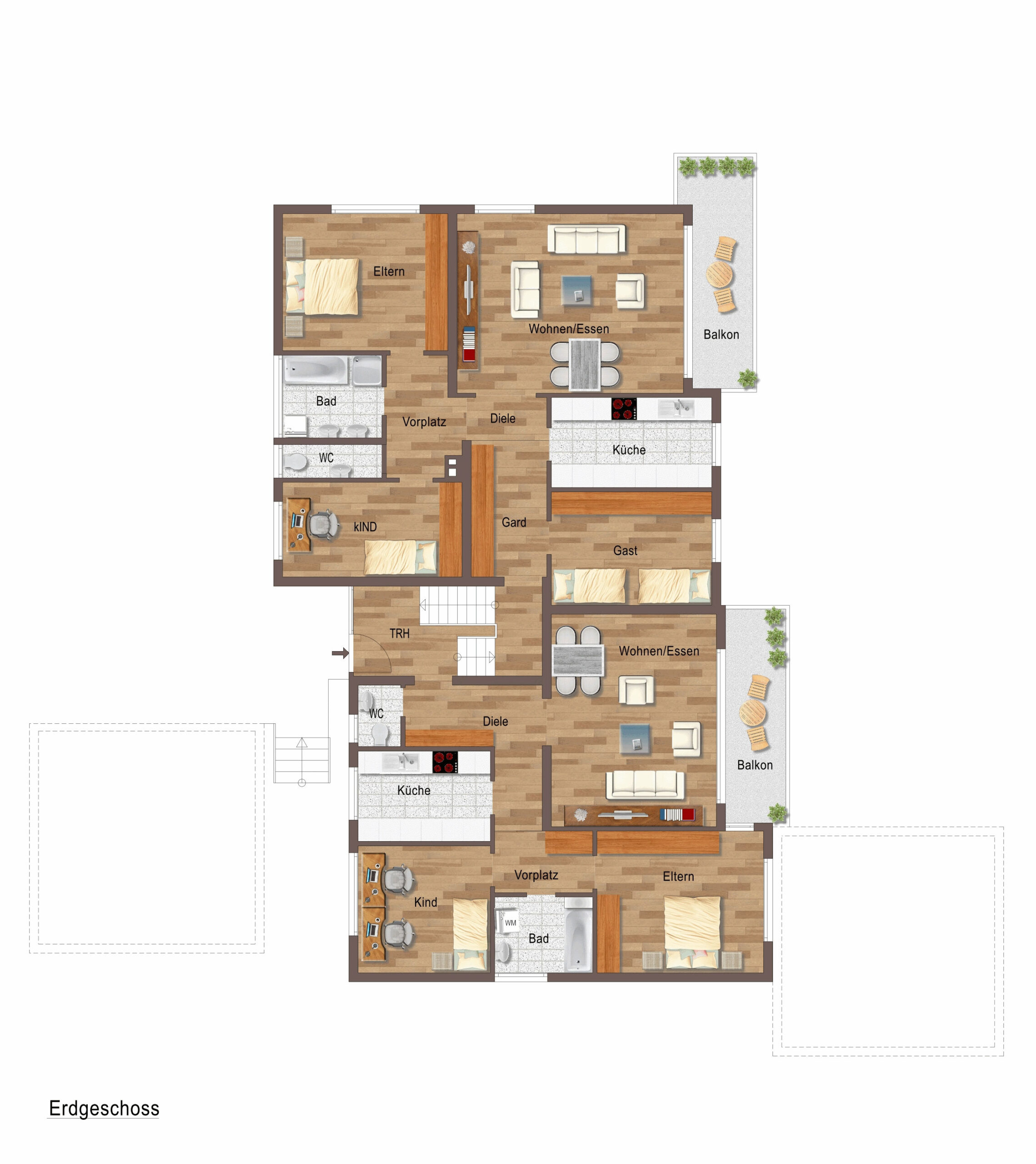 Im Erdgeschoss befinden sich eine 4-Zimmer-Wohnung mit großem Flur, Schlafzimmer, zwei Kinderzimmern, Küche, Badezimmer und separatem WC sowie eine 3-Zimmer-Wohnung mit Wohnzimmer, Küche, Schlafzimmer, Kinderzimmer, Badezimmer und separater Toilette. Beide Wohnungen verfügen über einen Balkon.