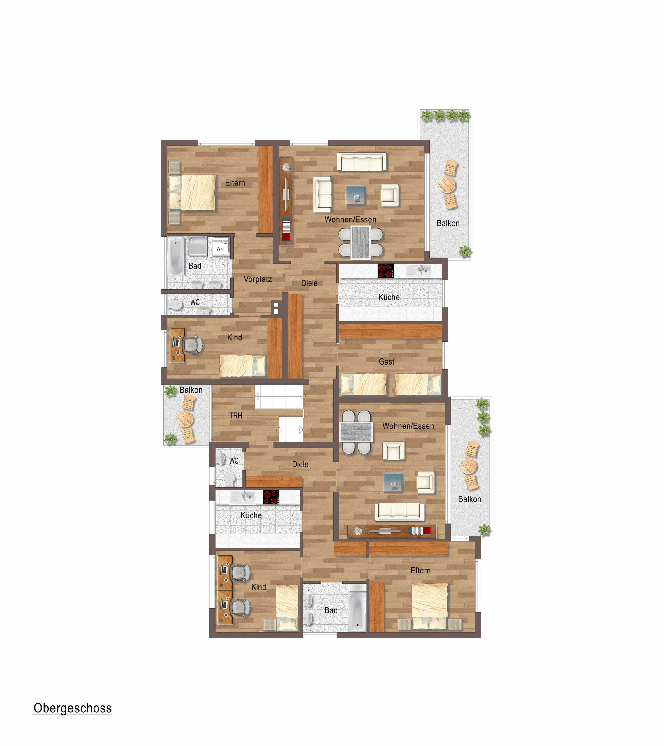 Die gleiche Raumaufteilung findet sich im Obergeschoss wieder: eine 4-Zimmer- und eine 3-Zimmer-Wohnung, jeweils mit Balkon.