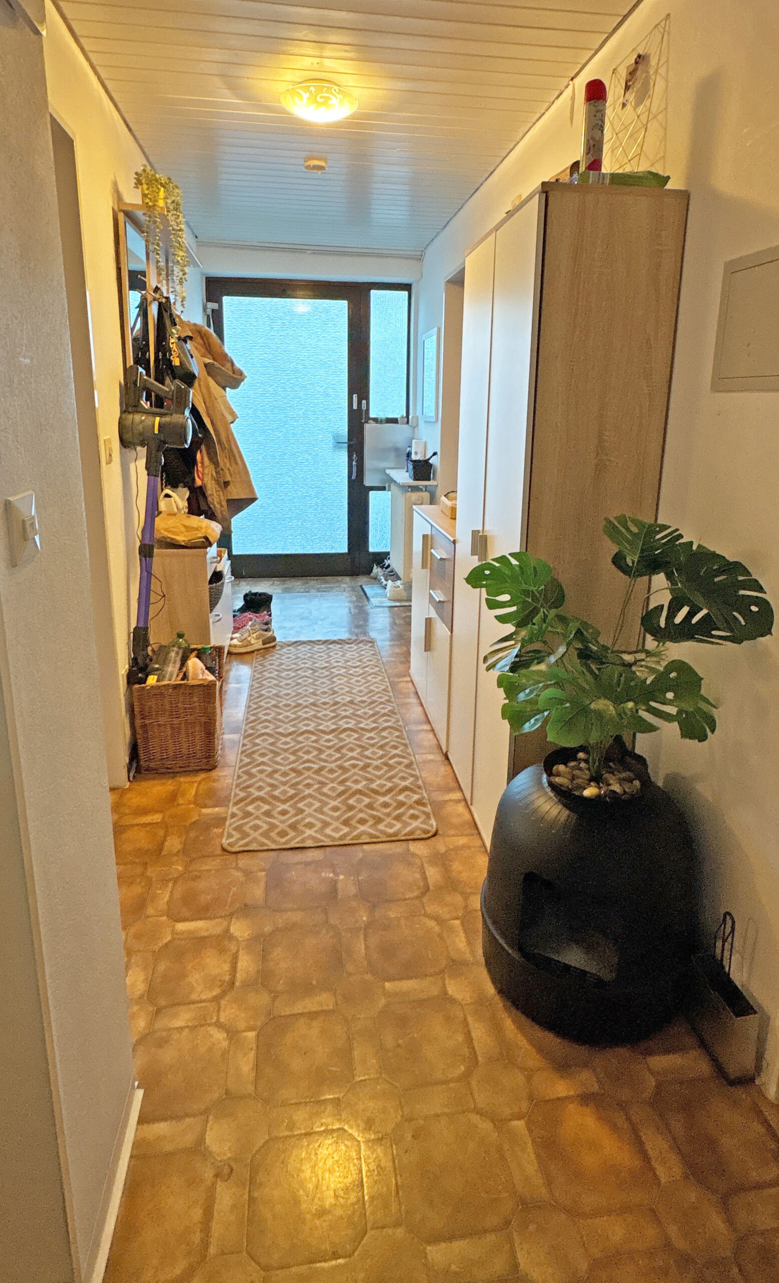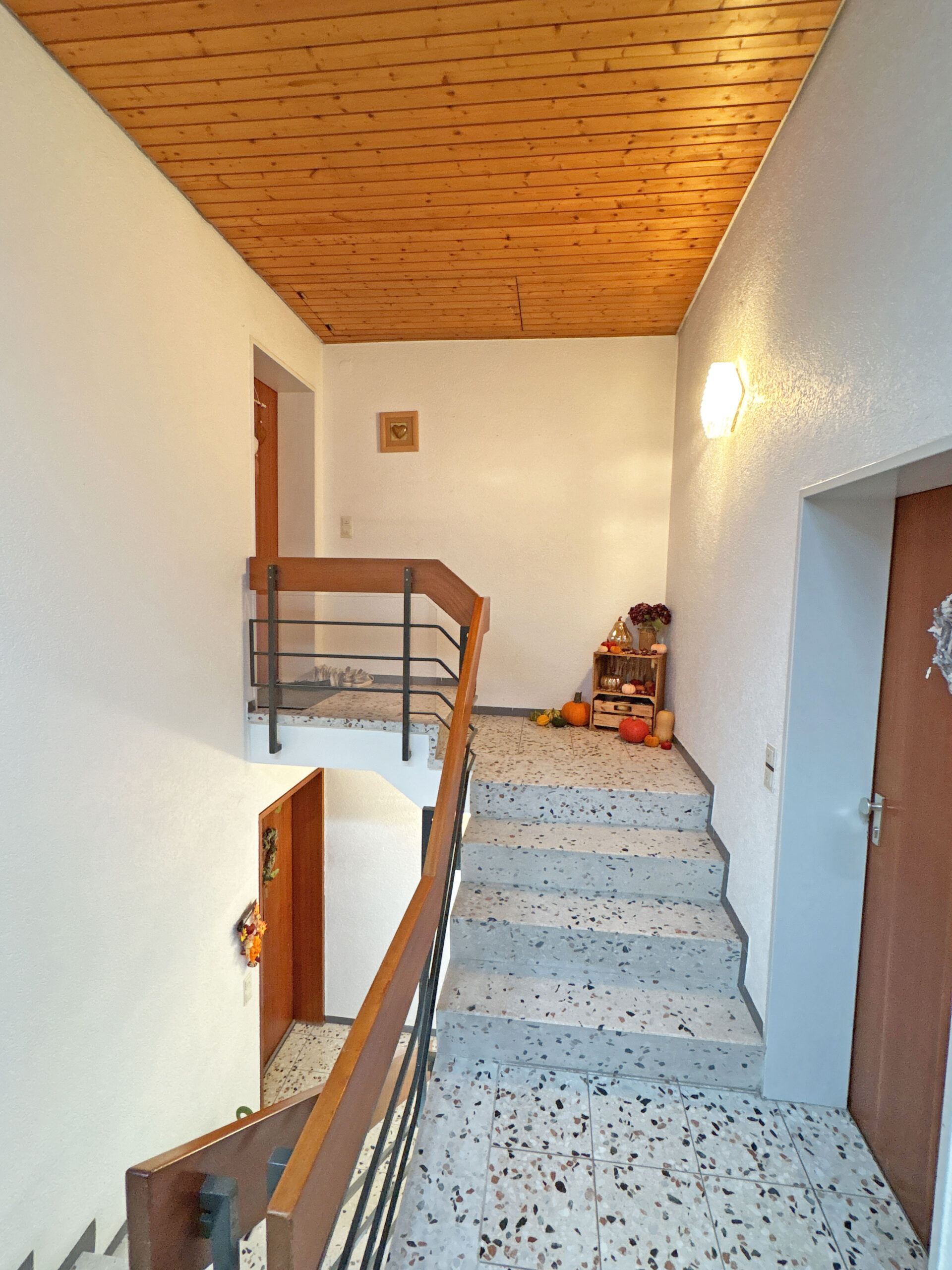 Das Treppenhaus des Hauses ist hell und freundlich gestaltet. Der Bodenbelag besteht aus hellen Kunststeinfliesen, die Wände sind mit Rauputz versehen. Die Hauseingangstür wurde durch eine moderne Metalltür mit Glaseinsatz und feststehendem Seitenteil samt Briefkastenanlage ersetzt. Ein hochwertiges Edelstahlhandlaufgeländer sorgt für ein ansprechendes Erscheinungsbild und zusätzliche Sicherheit.