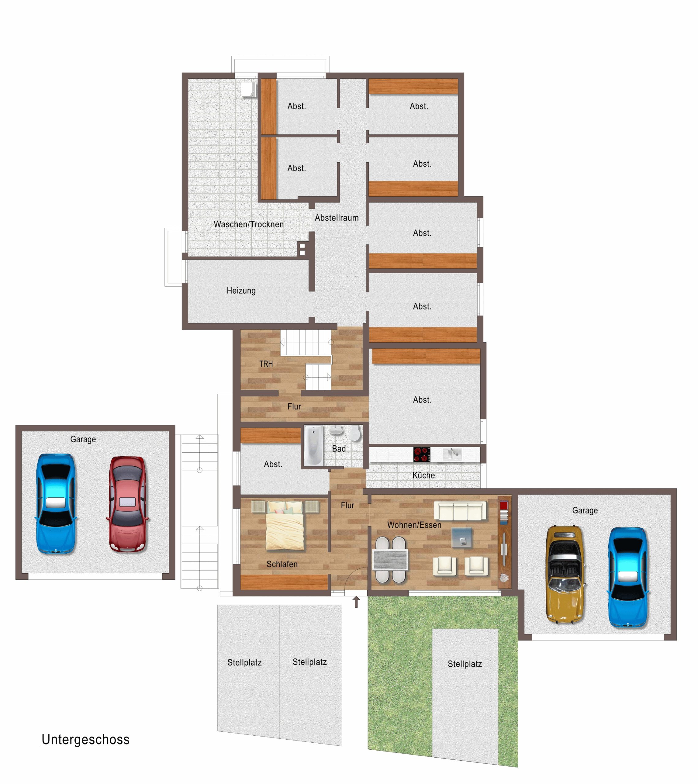 Im Untergeschoss befinden sich neben den üblichen Abstellräumen auch der Heizraum, der Öltankraum sowie ein Trockenraum. Die Böden im Untergeschoss sind mit einem Betonboden mit Staubschutzfarbe versehen.