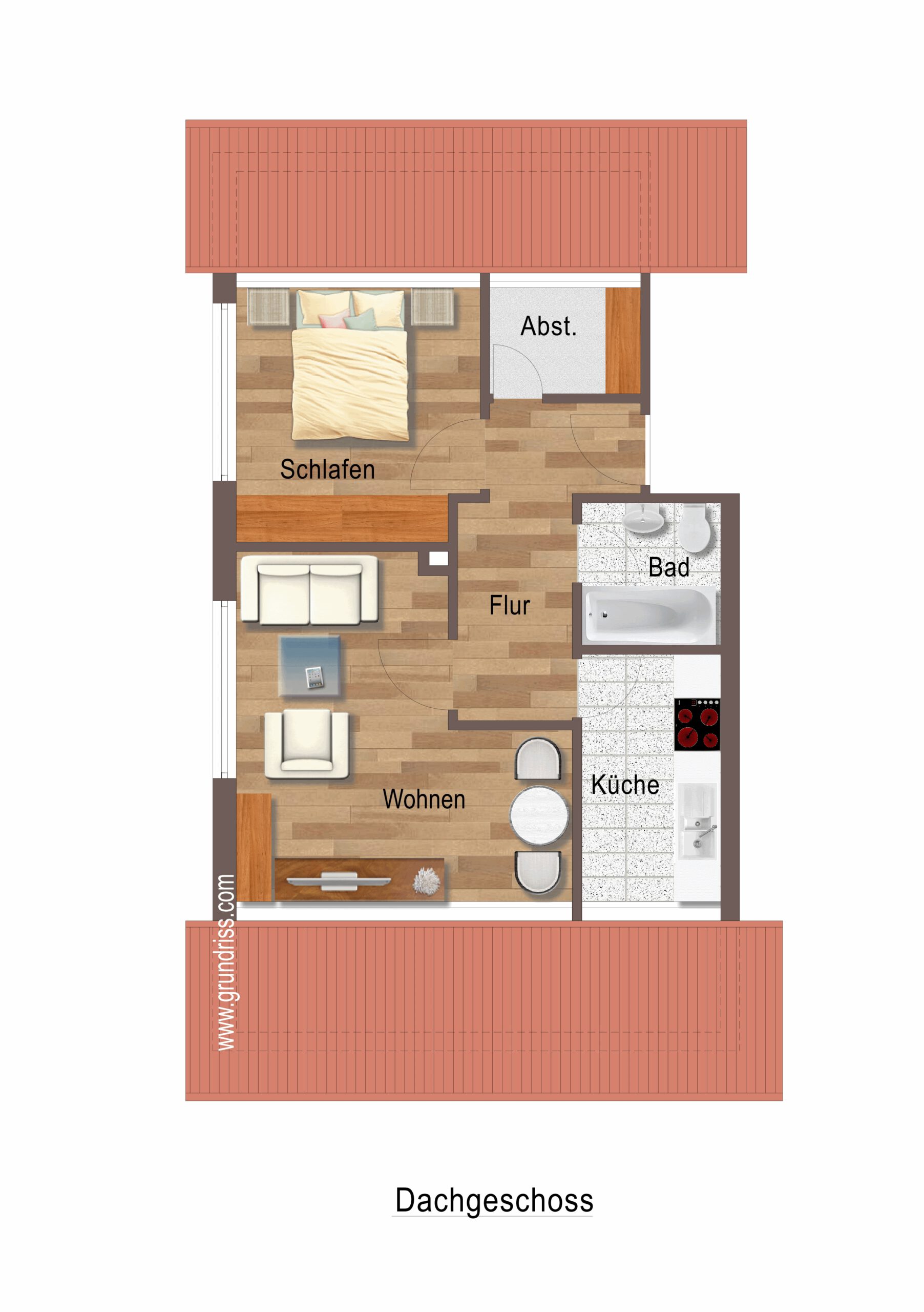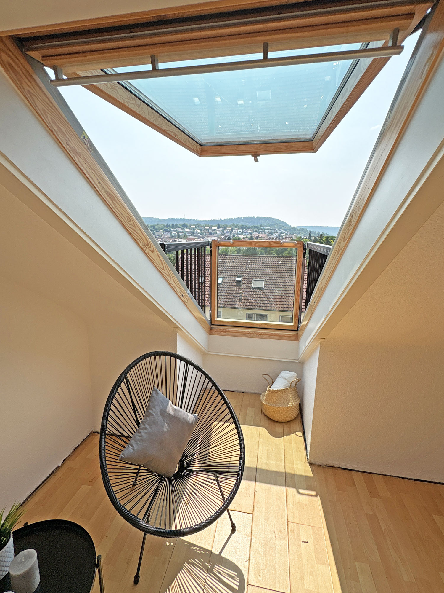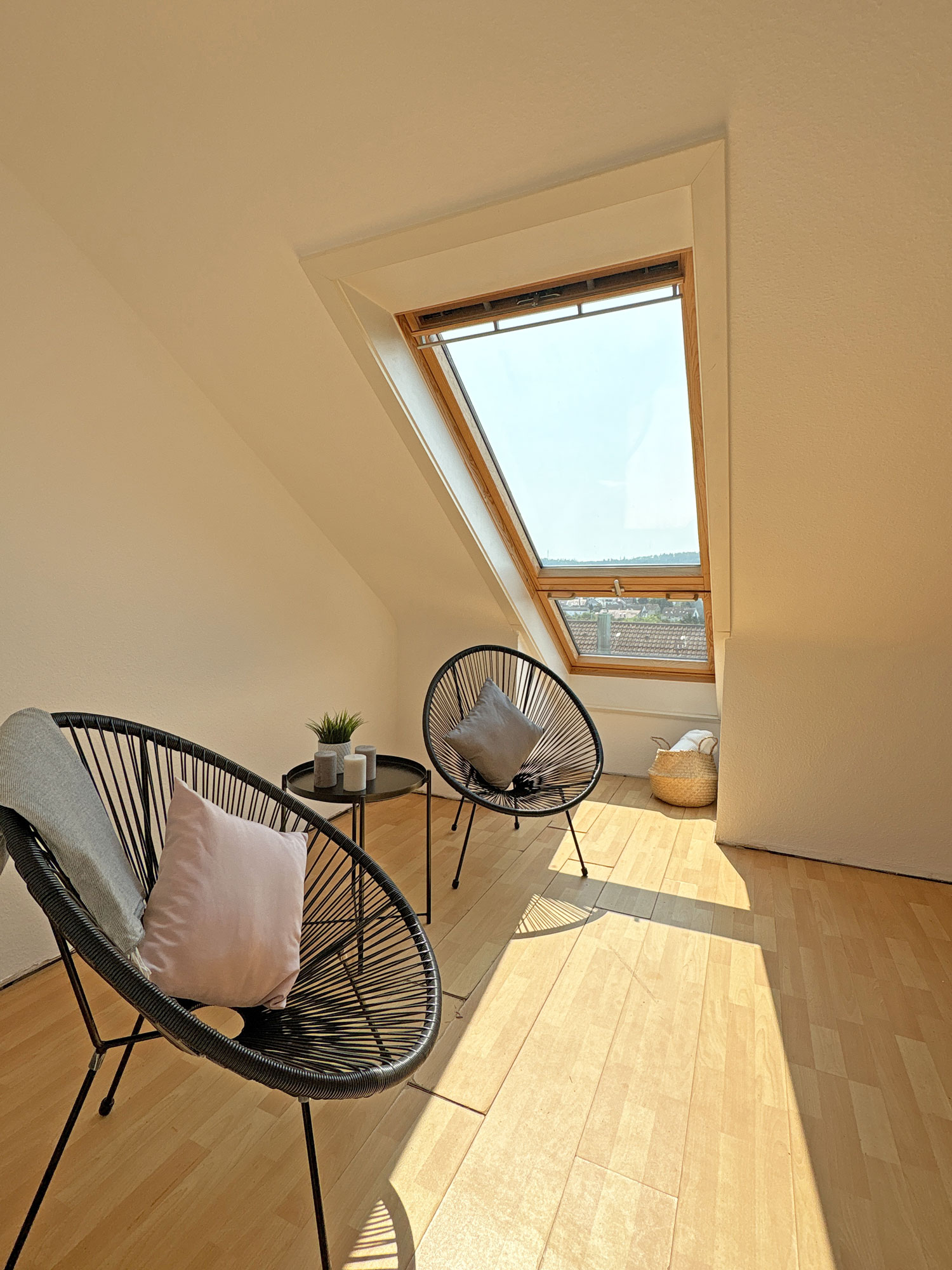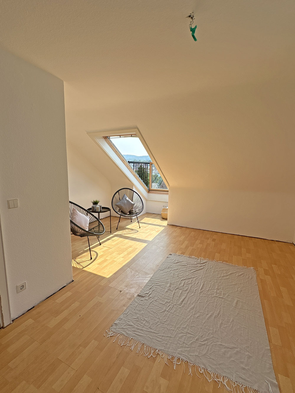 – Wohnzimmer mit gemütlicher Dachschräge, Dachfenster (teils als kleiner Balkon nutzbar) und warmem Laminatboden.